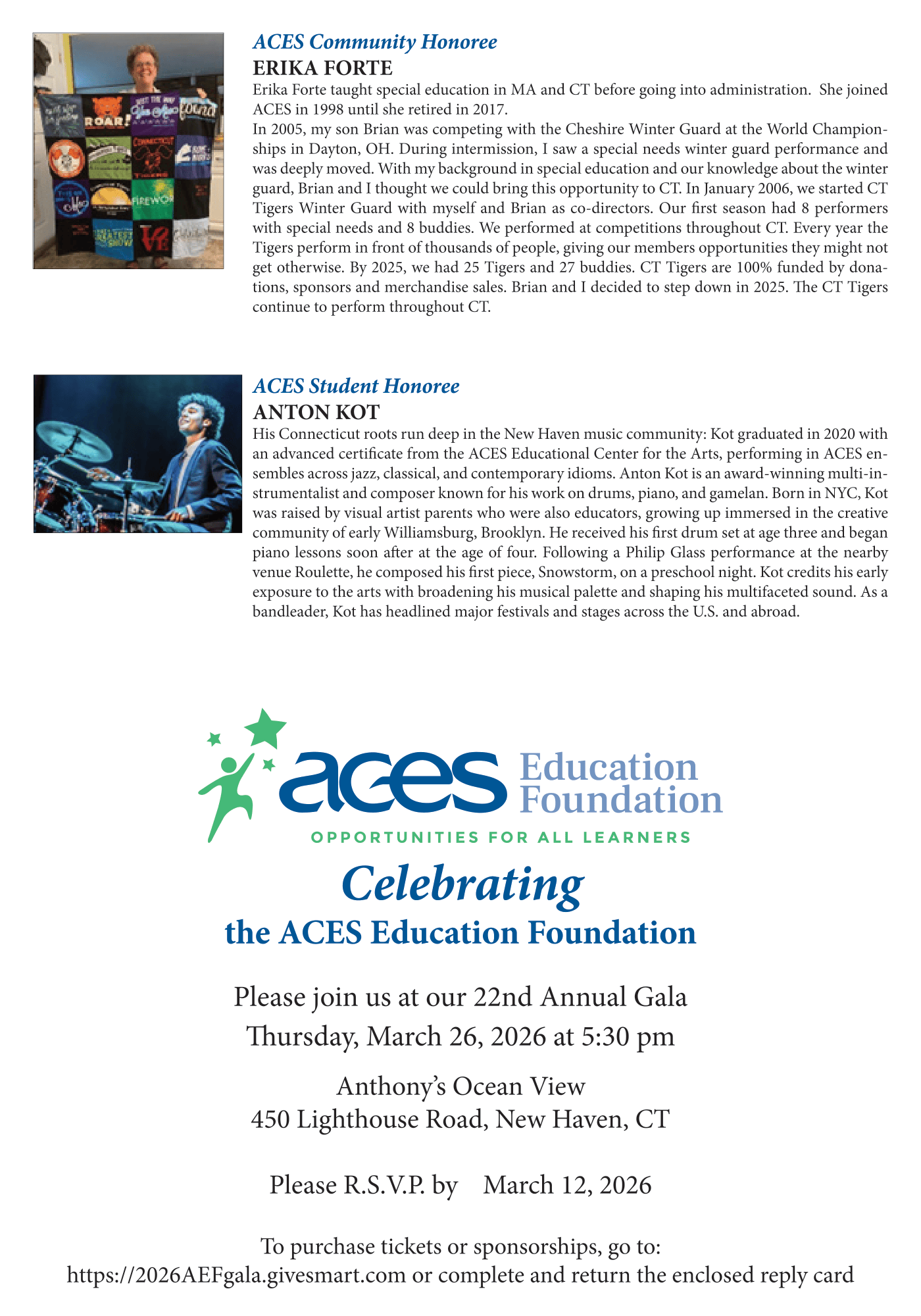 ACES Alfred E. Hopkins Memorial Scholarship Fund awarded five scholarships in the amount of $1,000 each to students at ACES Education Center for the Arts for Advanced Study in the Arts.