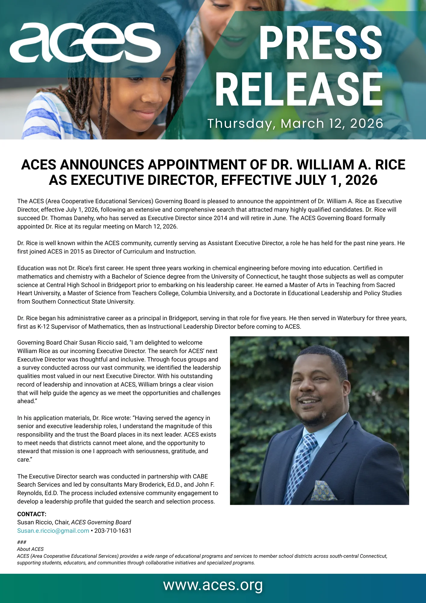 ACES ANNOUNCES APPOINTMENT OF DR. WILLIAM A. RICE AS EXECUTIVE DIRECTOR, EFFECTIVE JULY 1, 2026