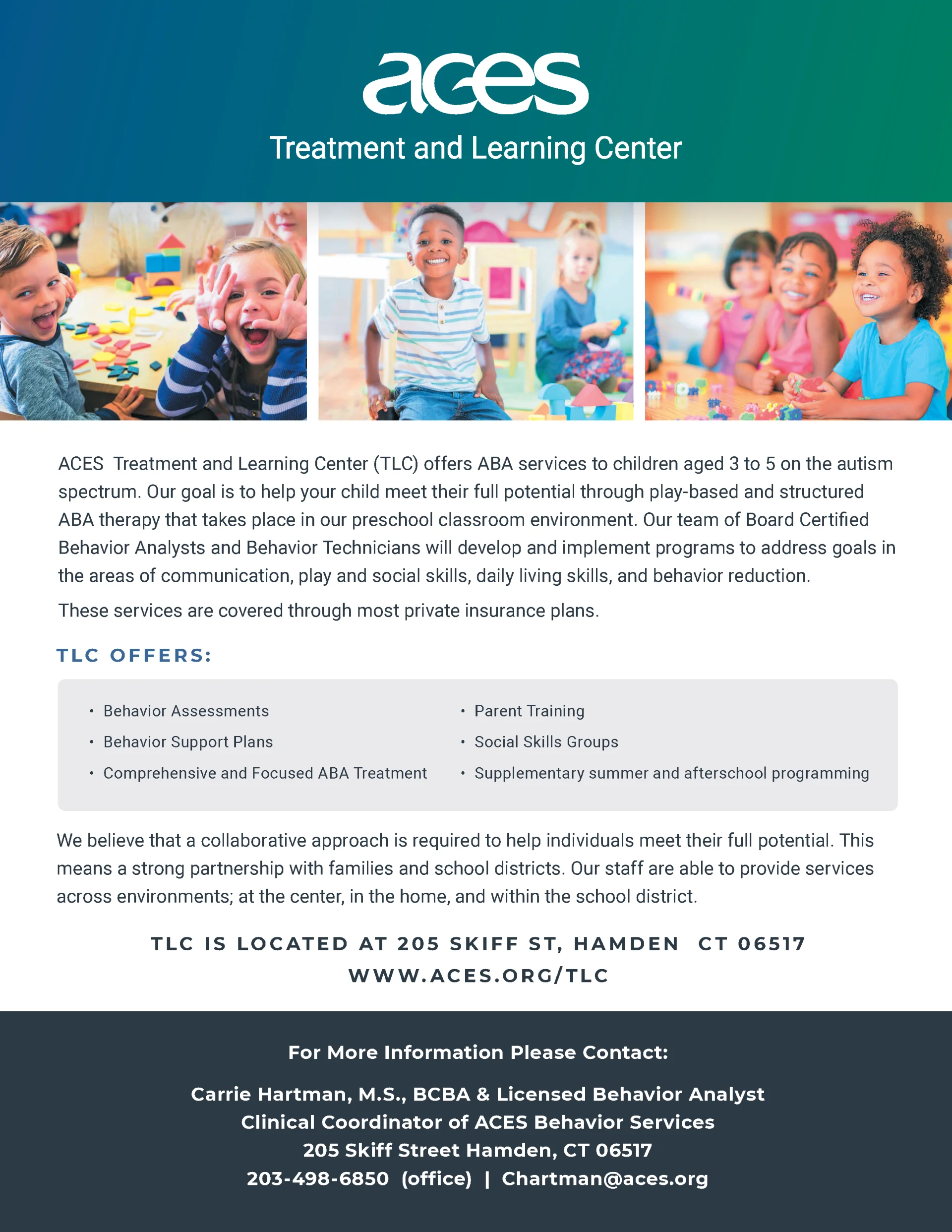 The ACES Treatment and Learning Center (TLC) offers a wide range of services to individuals from the greater New Haven area. TLC is staffed full-time with a team of Board Certified Behavior Analysts and Registered Behavior Technicians and offers ABA services to children ages 3 to 5 with Autism Spectrum Disorder and other disabilities. In addition to ABA services, TLC offers speech and occupational therapy services.